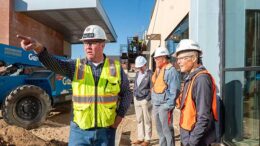 EA Director of Facility Planning and Construction Jeremy Hughes speaks with Susan Wood, EA vice president of academic and student affairs, in the future walkway between the cosmetology building and the Copper Mountain Clinic Thatcher. (Photo by Sophia Saldana, Eastern Arizona College)