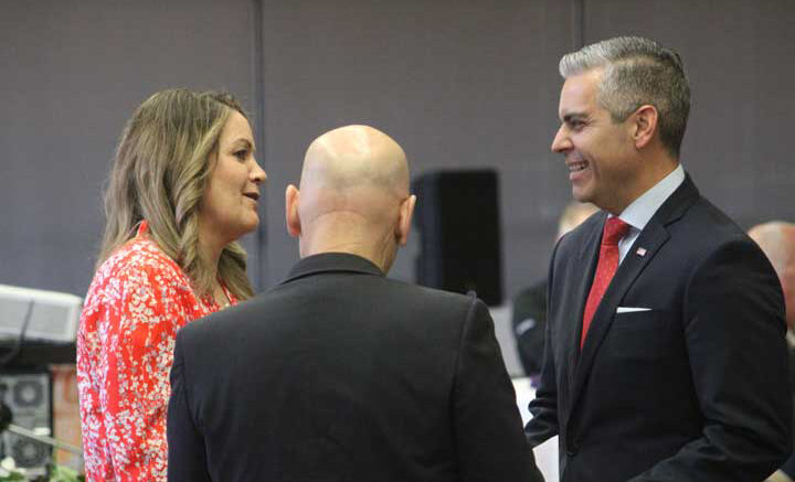 Graham County Republican Committee Chair Marianne Clonts and U.S. Rep. Juan Ciscomani, R-Ariz., right, chat before the Graham County Lincoln Day Luncheon, on Feb. 20, 2023. - David Bell Photo/Gila Valley Central