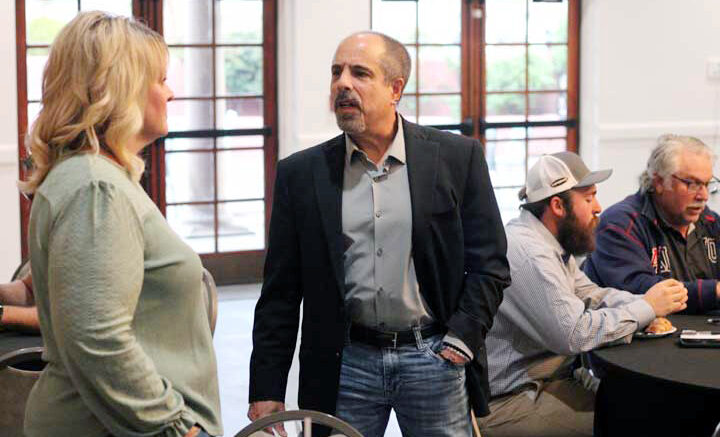 Safford City Manager John Cassella, seen here talking with Copper & Cotton Lifestyle Co. owner Tricia Garrett during the Safford Spotlight on Business event April 1, 2024, will be the keynote speaker at the city's Spotlight on Development event July 18 at the Library Annex. - David Bell Photo/Gila Valley Central