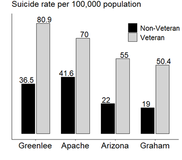 Last, most veteran suicides in Apache, Graham, and Greenlee counties are committed with a firearm (73%). Precautions should be taken by using gun locks or removing guns in the homes of elderly veterans (as well as all others) who are exhibiting risk factors for suicide. These are hard conversations to have with our loved ones, but they are necessary.