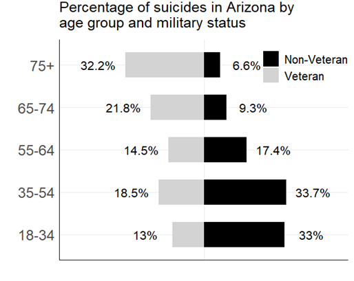 3. The suicide problem among veterans is concentrated among older residents. Whereas about 33% of Arizona suicide victims are 18-34 years old, about 13% of veteran suicide victims are that age. Conversely, roughly 32% of all veteran suicide victims are 75 and older, compared to 6.6% for non-veterans.