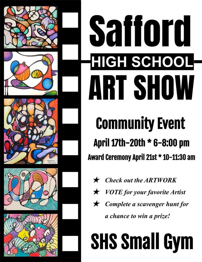 The Safford High School Art Department will showcase art student’s work in a free art show April 17 – 20th, 2023 in the Safford High School small Gym. The exhibit will be open to the public from 6:00 PM until 8:00 PM each night. Approximately 400 pieces of art created by about 150 students will be on display.