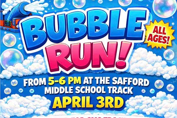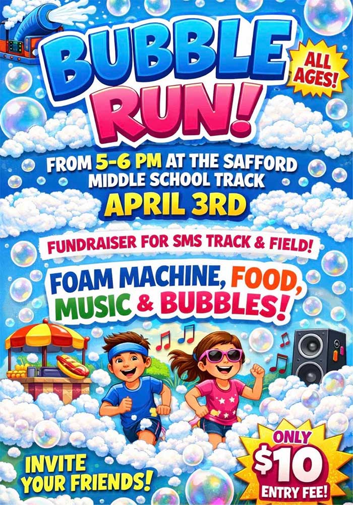Safford Middle School Hosting Bubble Run Fundraiser Posted By: Staff March 31, 2026 Safford Middle School Track & Field is hosting a fundraiser Bubble Run Friday, April 3, 2026 from 5 until 6 PM at the Safford Middle School Track. For a $10.00 entry fee attendees can enjoy a foam machine, food, music and bubbles. Comments comments