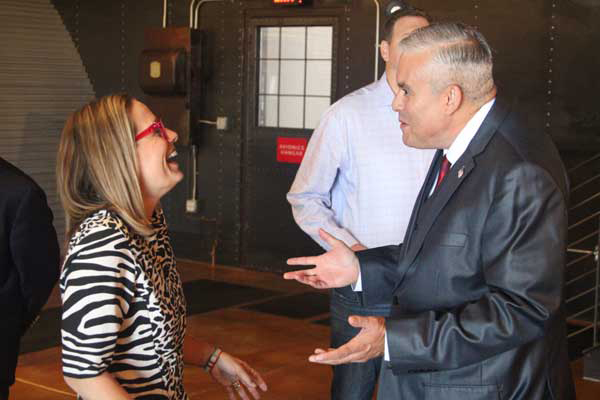 U.S. Sen. Kyrsten Sinema, D-Ariz., shares an anecdote with Safford City Councilman Mike Andazola following a round-table meeting with local leaders at Pondersoa Aviation on Tuesday. - David Bell Photo/Gila Valley Central